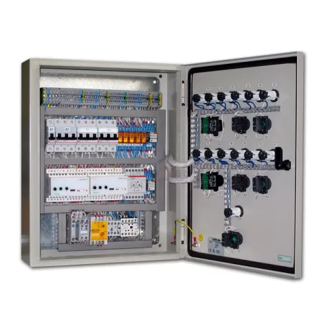> Индикация с помощью лампочек на передней панели о подаче питания на щит, работе/аварии, отключении автоматического режима, срабатывании пожарной сигнализации. Возможность добавления звуковой сигнализации и защиты от несанкционированного вмешательства.