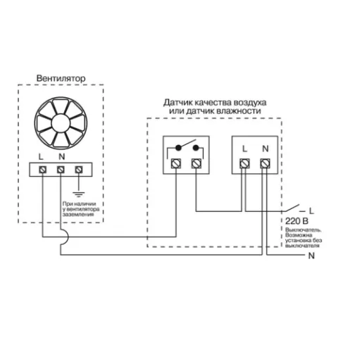 Предназначен для контроля за качеством воздуха в помещении. Дым, запахи, влажность и другие загрязнители снижают качество воздуха. Этот датчик позволяет отслеживать заданные параметры качества воздуха и управляет включением вентилятора, когда концентрация загрязнителей выше установленного предела. После приведения воздуха в норму вентилятор будет продолжать работать таймерное время от 1 до 25 минут.