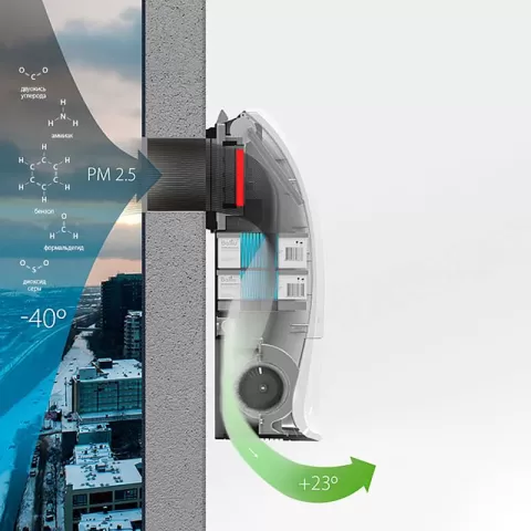 При низкой внешней температуре высокоэффективный керамический нагревательный элемент автоматически подогревает входящий воздух до комфортного состояния.