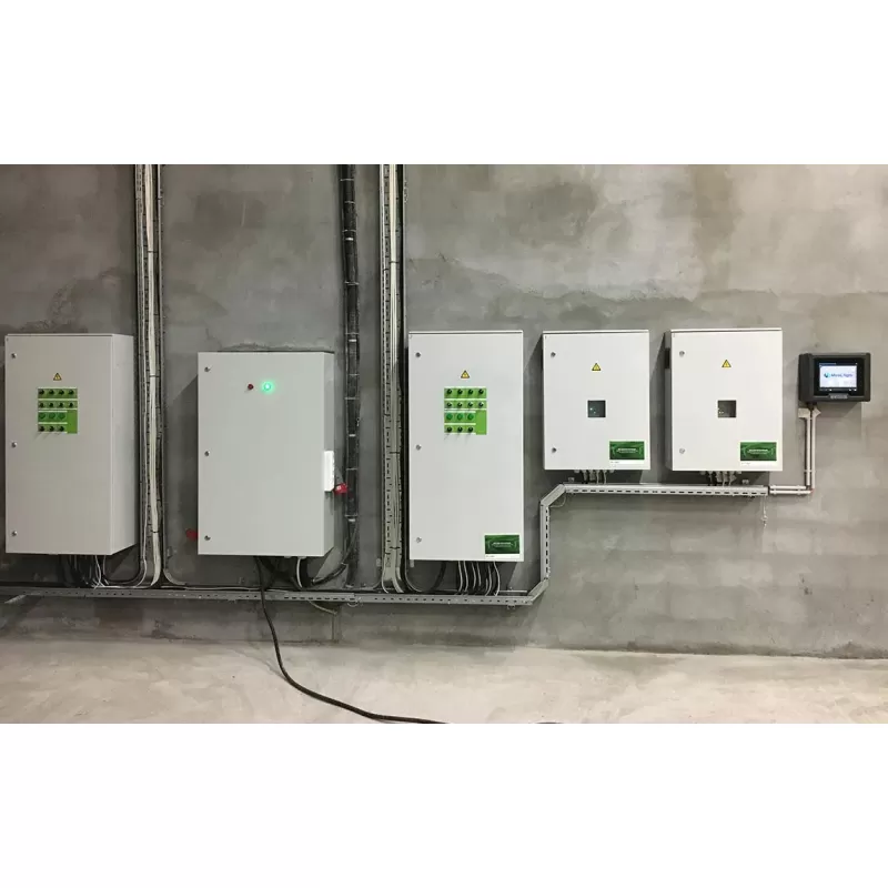 Для подключения к питающей сети и управления вентиляторами, отопительными приборами, насосами систем охлаждения, сервомоторами, линиями освещения, системами кормления и поения, необходима установка силового шкафа управления.В щит устанавливается коммутационная аппаратура, пускатели, автоматы защиты, частотный преобразователь, трансформатор, вводной рубильник и другие комплектующие.